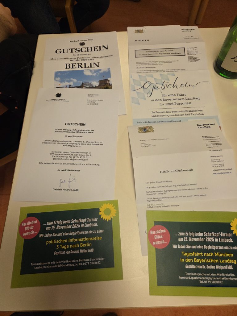 Der Sieger durfte sich als Erster einen Preis aus den bereitgestellten Gewinnen aussuchen. Die Preise reichten von mehrtägigen Fahrten nach Berlin oder München (in den Landtag), die von Politikern unterschiedlicher Parteien gespendet wurden, bis hin zu Sachpreisen wie Wein, Stadtwurst und diversen anderen Köstlichkeiten. Wir danken allen Spendern und Gönnern für die Bereitstellung der Preise.